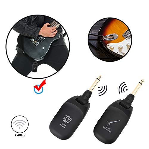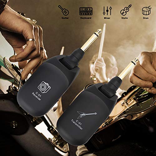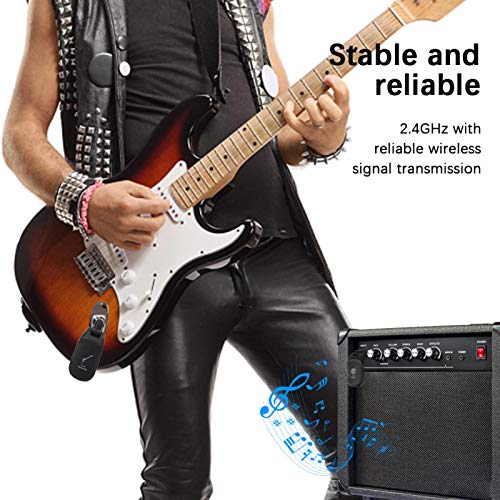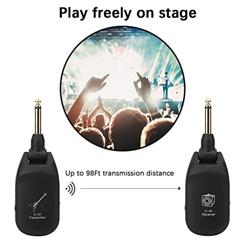 Stabiel en betrouwbaar — Gitaar draadloze ontvanger is stabiel en betrouwbaar, 2,4 GHz kan een betrouwbare draadloze signaaloverdracht behouden. De maximale transmissieafstand kan 98Ft bereiken, waardoor je vrij op het podium kunt spelen.